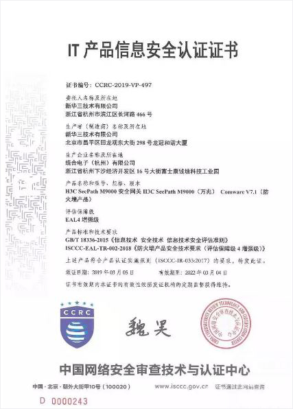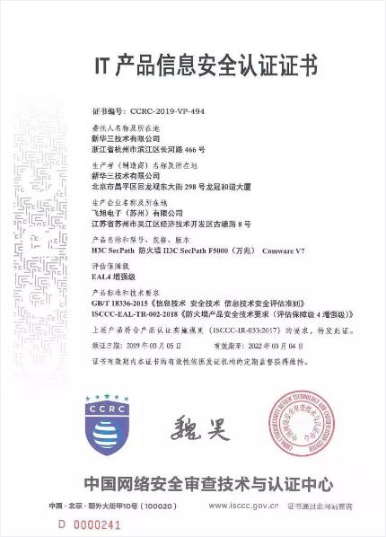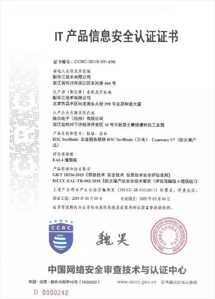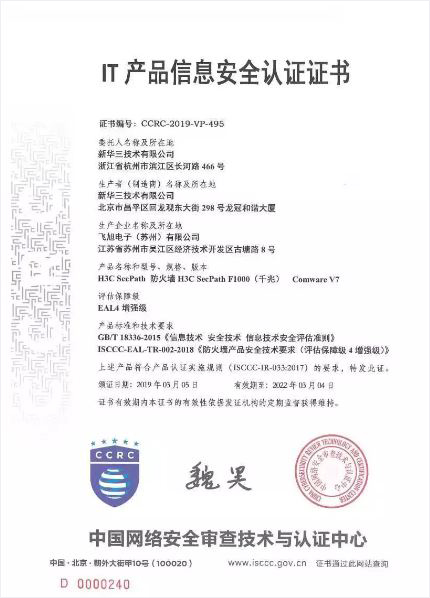 新華三全系列防火墻獲得國內(nèi)首家EAL4增強級(最高級)認證