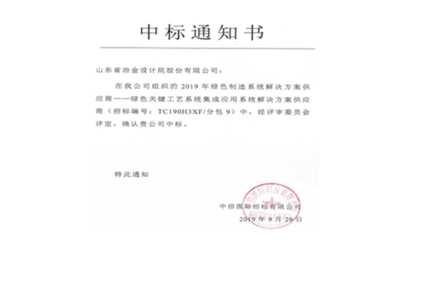 近日,在中華人民共和國工業和信息化部節能與綜合利用司2019年綠色制造系統解決方案供應商招標中,公司中標綠色關鍵工藝系統集成應用系統解決方案供應商。