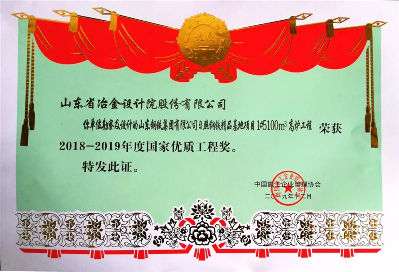 12月8日,2018-2019年度國家優(yōu)質(zhì)工程獎總結(jié)表彰大會在國家會議中心舉行,由山冶設(shè)計總體規(guī)劃、自主設(shè)計并采取“EPC”總承包模式建成的山鋼集團日照精品基地1#5100m3高爐工程喜獲國家優(yōu)質(zhì)工程獎。