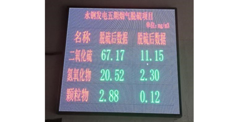 公司EPC總承包的聯(lián)峰鋼鐵有限公司電力廠5#煙氣脫硫項(xiàng)目自投運(yùn)以來,通過對(duì)鍋爐煙氣脫硫前后參數(shù)的采集與對(duì)比,對(duì)脫硫劑小蘇打的噴吹量實(shí)現(xiàn)自動(dòng)調(diào)節(jié),經(jīng)過一個(gè)月的調(diào)試,除塵器出口煙氣含塵顆粒物、SO2,氮氧化物的含量均低于國家超低排放行業(yè)標(biāo)準(zhǔn),達(dá)到公司承諾運(yùn)行保證值,滿足性能考核要求。脫硫后的排放數(shù)據(jù)實(shí)時(shí)顯示到大屏,對(duì)外公布。