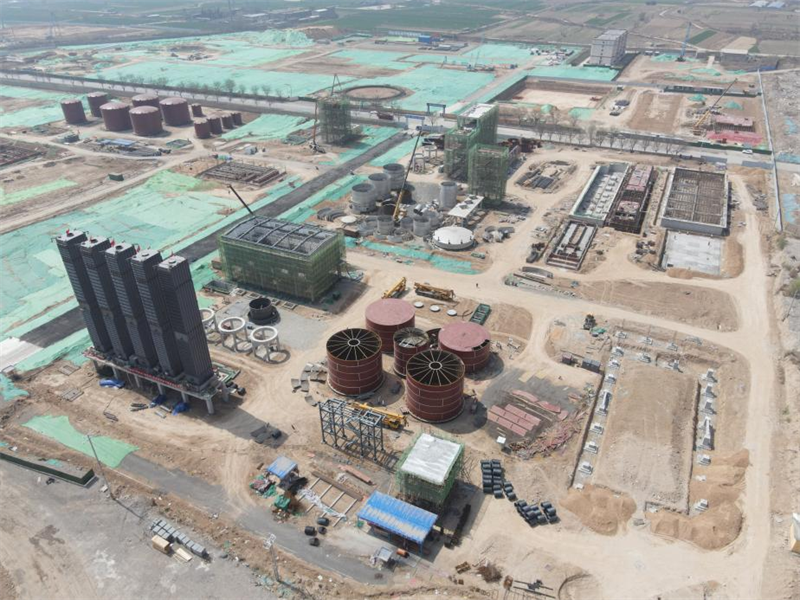 煤氣凈化區(qū)域的鼓風機站、蒸氨框架、脫氨廠房土建結構已經(jīng)封頂,循環(huán)水泵房以及集水池已經(jīng)完成澆筑,油庫區(qū)、焦油氨水分離區(qū)域的罐體逐步封頂,初冷器設備安裝完成,脫硫、終冷洗苯以及電捕等主要設備的安裝以及埋地管道的施工已在進行中。